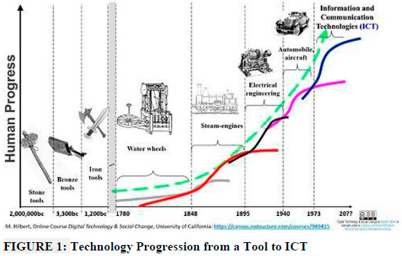According to Kamel and Wahba (2002 and) Kamel (2008), information and communication technology (ICT) is not only an essential building block of a society but also the driving force behind social development in today's society. Noted also about ICT is that as the human population is growing, today's generation is in the period whereby mediated information and communication have become the catalyst of human progress that requires a deepened understanding of how social and technological revolutions transformed societies from simple adoption of a tool during the agricultural revolution to mobile ICT (Figure 1). The ICT progress and development are setting the pace for a changing community in developed countries where the process seems fast and realistic but a bit bouncy in the developing world (Kamel, 2008). Figure 1 shows the technology progression from a tool to ICT, which also helps explain the stages in the fourth industrial revolution described by Xu, David and Kim (2018).
