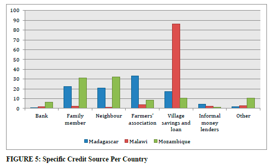 In Mozambique, 63.5% of respondents indicated that they acquired credit from a family member or a neighbour. Regarding Malawi, 86% of respondents indicated village savings as their primary source of credit. Malagasy respondents indicated that their main sources of credit are a farmers' association, family members, and neighbours. Interestingly, the formal banking system was not rated high as a source of credit (FIGURE 5).