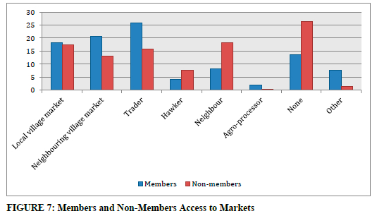 Members of farmers' associative mechanisms indicated that they mostly sell their crops and livestock by using a trader and at neighbouring village markets. Non-members mostly selected none among all the listed options. This could either mean that the means or structure that non-members use to sell their products were not indicated in the list or that they do not sell their produce but keep it for personal use. Furthermore, non-members indicated that they sell their produce mostly to neighbours, at the local village market, and by using a trader. The network non-members use to sell their products seems much more confined to their community and immediate surroundings. It could then be argued that a farmers' association allows its members to sell their products to a wider network, exposing farmers in ways to use traders and access markets a bit further away than neighbouring village markets. This shows the role that farmers' associative mechanisms play with regard to linking their members with a wider network of other farmers, giving them easier access to other services like traders and credit services (FIGURE 7).