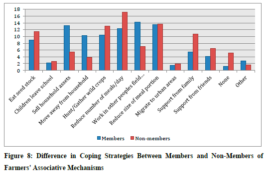 Farmers' associative mechanisms play a major role in their risk management function. This was indicated both in the literature and in the study. Related to the risk management function, the data of members and non-members were considered, along with the coping strategies that they use after experiencing a disaster. The coping strategy that members of a farmers' association use firstly, as indicated in the data, is sending a household member to work in other people's fields and take food as payment for the labour. Secondly, members reduce their food portions at mealtimes to cope with the effects of a disaster; thirdly, they sell household assets such as land, livestock, ox-drawn carts, and other physical assets. Non-members handle the effects of a disaster quite differently by reducing the number of meals per day and reducing the portions of food at mealtimes (Figure 8).