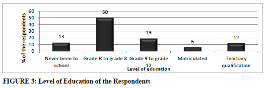 There was a lot of variation between respondents regarding their level of education (Figure 3). It was found that 13% of the respondents have never been to school, while 50% went from grade R to grade 8, and about 19% went from grade 9 to grade 12 (Figure 3). Lastly, about 6% of the respondents matriculated, while about 13% had tertiary qualifications. However, the level of numeracy among respondents is reasonable. These results indicate that small-scale farmers' education level is sufficient to interpret and understand their challenges and production practices.