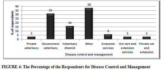 Diseases are a major cause of economic losses in sheep production systems because they can lead to the death of sheep. Disease control and management are important to maintain the health and productivity of small-scale sheep farming systems. A critical aspect of disease control management in small-scale sheep farming systems is creating and maintaining a flock health plan. The study revealed that 3% of the respondents use private veterinary services, 31% use government veterinary services, 16% use veterinary chemists, 38% use other methods, and 6% use extension services (Figure 4). Lastly, 3% of the respondents use government veterinary and extension services. The results indicate that government veterinary and other services are used most, while private veterinary and a combination of government veterinary and extension services are being used least. Private veterinary services may not be used primarily due to the high costs involved. It can be concluded that even small-scale sheep farmers in the study area may improve their livestock through veterinary services, as farmers may lack the resources and knowledge to control diseases on their own.