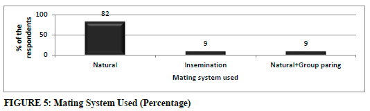 Lastly, in the present study, 82% of the respondents use natural methods for mating the livestock, 9% use insemination, and 9% use a combination of natural methods and group paring (Figure 5). The results indicate that the small-scale sheep farmers in the study area may not be practising insemination and a combination of natural and group paring due to the high costs involved.
