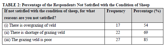 For the respondents who were unsatisfied with the condition of their sheep, about 54% indicated that this was due to overgrazing of veld, 69% claimed there was a shortage of grazing land, and 85% said that the grazing veld was poor (Table 2). This is a clear indication that the condition of sheep may be affected by a combination of overgrazing of veld, shortage of grazing veld and poor grazing veld. Todd et al. (2009), Molotsi et al. (2017), and Zenda and Malan (2021) found similar results that overgrazing and a decline in plant biodiversity are common in small-scale sheep farming systems in South Africa. Overgrazing has significant consequences on the livelihoods and vulnerability of small-scale sheep farmers, exposing them to various risks. In many communal grazing areas of South Africa, rangeland deterioration has negatively affected sheep production due to overgrazing (Mudau et al., 2022). Overgrazing causes a decline in palatable grass species and an increase in less nutritious plants, such as shrubs and bushes. This reduces the rangeland's carrying capacity, affecting sheep's productivity. Therefore, there is a need for veld monitoring to determine whether grazing management techniques prevent overgrazing to meet sustainable resource utilisation goals. Furthermore, Allsopp et al. (2007) found similar results: there is a shortage of grazing land in the communal areas of Liliefontein in Northern Cape Province. Shortage of grazing land has a significant effect on the stocking rates of livestock. This means that if there is a shortage of grazing veld, farmers will be forced to reduce their stocking rates to meet sheep's feed requirements. This may result in the farmers producing sheep of low market value and unproductive livestock. Solutions could include improving veld management practices such as rotational grazing to address the challenge of poor grazing veld. This allows the veld to rest and regrow between grazing periods, which helps to prevent overgrazing and maintain the productivity of the veld. These results indicate that the issues of overgrazing of veld, shortage of grazing veld, and poor veld must be addressed.