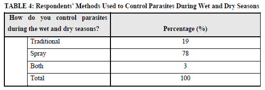 Methods to control farm parasites during wet and dry seasons are important. During the wet and dry season, parasite control measures can include spray, traditional methods and government extension services. The results show that 19% of the respondents use traditional methods to control parasites during the wet and dry seasons, 78% use spray, and 3% use government and extension services (Table 4). This shows that small-scale farmers in the area are more aware of using sprays to control parasites than of traditional methods. Using spray to control parasites during wet and dry seasons is more effective and expensive. Under these circumstances, small-scale sheep farmers may be forced to develop their traditional remedies to control parasites, which are sometimes ineffective. Using spray effectively controls external parasites and may help increase and improve the performance of the sheep kept. There is also a need for caution when using natural remedies to control parasites to avoid the wrong dosage, as this may damage sheep's skin.