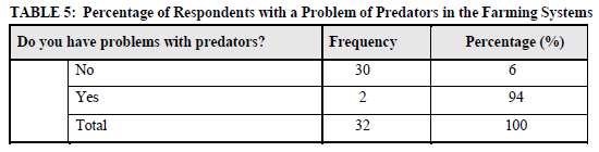 Predation can cause direct economic losses through the loss of sheep, and it can also cause indirect losses through increased stress and reduced productivity. The results from the study indicate that predators are one of the biggest challenges for small-scale sheep farmers in the area, with 94% of the respondents indicating that they face problems with predators and 6% indicating that they do not (Table 5). Predation is common in many rural communities of small-scale sheep farmers. It directly influences the economic and social well-being of farming since many sheep farming systems are largely farmer-dependent. Allsopp et al. (2007), Meissner et al. (2013), and Strauss, Avenant and De Waal (2021) reported a similar problem of predation as the major concern in small-scale farming systems in South Africa. Predation is a bigger threat to sheep welfare (Montossi et al., 2013; Strauss et al., 2021; Maluleke, Mpatheni & Nkosi, 2022). This is because sheep cannot defend themselves compared to other livestock. With this kind of response raised by farmers in the study area, there is no doubt that there will be more sheep deaths due to predation. The issue of predation may reduce the sheep numbers in the study area. This indicates that the predator problem needs to be addressed as soon as possible. Predation can be controlled by regularly maintaining fences on the farm. Sheep may crawl under poorly erected fences, resulting in attacks by jackals; therefore, the farms need proper fences. Several strategies can be used to prevent predation, including livestock guarding dogs, predator-proof fencing, and deterrents such as lights and noise-makers.