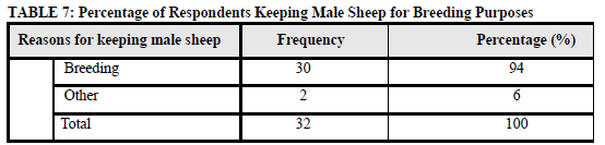 It is also important to consider that breeding is vital for the productivity of small-scale sheep farming systems. Animal breeding practices can be used to improve the productivity of small-scale sheep farming systems, but they must be targeted to the constraints and opportunities of those farming systems (Molotsi et al., 2017). The results show that 94% of the respondents indicated keeping male sheep for breeding, while 6% indicated keeping male animals for other purposes (Table 7). This shows that small-scale farmers in the area are aware of keeping male animals for breeding practices to achieve sustainable sheep production.