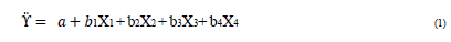 Where X1 and X2 are the four independent variables, Y represents the dependent variable, and the constants are a, b1, b2, b3, b4.