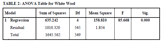 Therefore, the model with all independent variables (fibre diameter, staple length, vegetable matter, and clean yield) of White wool has a significant influence on the determination of the wool price (F (4.545) =85.668, p < 0.05).