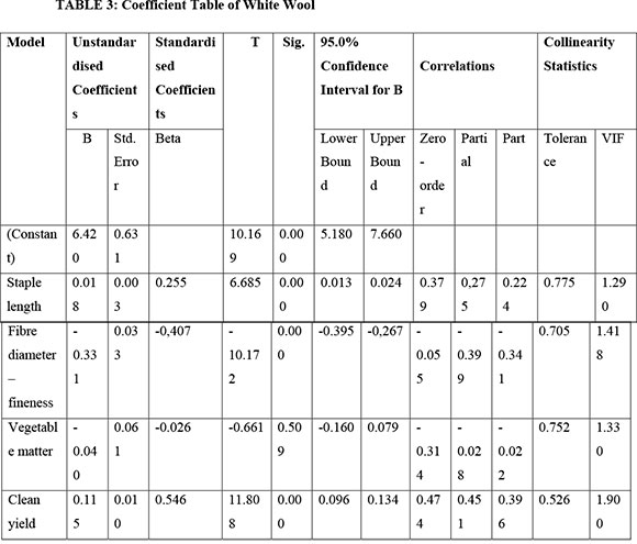 To evaluate the statistical significance of the results, the F statistic is presented in Table 2. As illustrated here, the value of F was 85.668, with a significance of 0.000. Fibre diameter, staple length, vegetable matter and the clean yield on White wool significantly influenced the wool price.