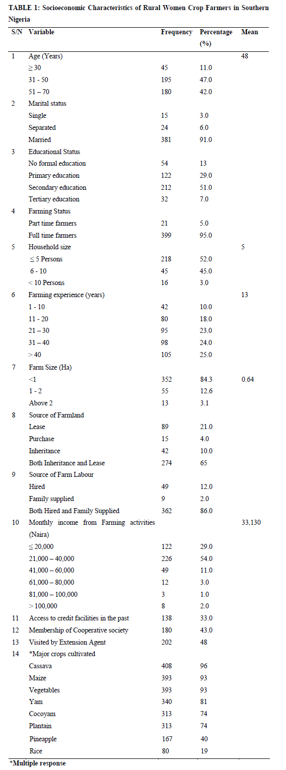 Results in Table 1 show the socioeconomic characteristics of the rural women crop farmers in the zone. It shows that 91% of the rural women are married with a mean age and household size of 48 years and five persons, respectively. Most of them had secondary education (51%).