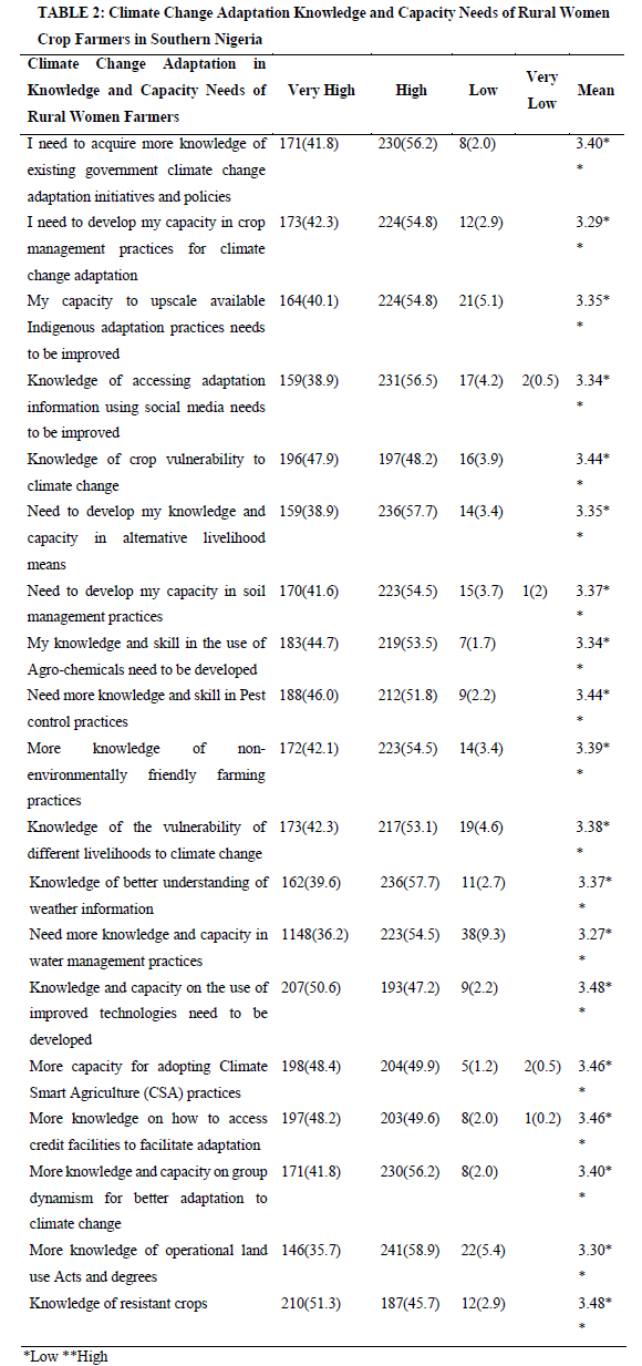 Analysis of Climate Change Knowledge and Capacity Needs of Rural Women Farmers in Southern Nigeria