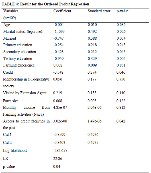 In addition, the ordered probit model is used to determine the relationship between rural women crop farmers' knowledge and capacity needs and their socioeconomic characteristics. To justify the choice of model adopted, Akaike's Information Criterion (AIC) was used to select the model that provides the best fit based on the smallest AIC value. The AIC values between ordered probit regression (AIC = 595.3143) and ordered logit regression (AIC = 595.5641) were compared for best fit. Therefore, the ordered probit model was adopted for the analysis because it fits the model better. The result of the ordered probit regression is shown in Table 4. Given that the model is not linear and the coefficients are not probabilities, the marginal effect is estimated and presented in Table 5. The marginal effect was conducted to ascertain the probabilities of each outcome.