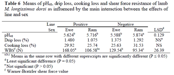 The pH48 and WBS values showed differences (P < 0.05) between the four groups. The NR group had the highest pH48 and the lowest WBS value. The significant difference in WBS values was, however, not reflected by findings of the taste panel for the attribute of first bite (Table 2). A possible explanation could be that the latter was conducted on the M. semimembranosus and the physical measurements on the M. longissimus. The latter muscle is known to be more responsive to temperature, genetics, cooking methods, etc. When ram and ewe groups were pooled (Table 7), differences (P < 0.05) were found for pH48, WBS values and cooking loss. Rams had higher ultimate pH and cooking loss values and a lower WBS value than ewes (P < 0.05). There was a tendency for the higher pH48 values to result in lower WBS values, with the pooled ram group having the highest pH48 value and the lowest WBS value. Results in Table 7 also indicate a line effect on meat tenderness. The positive line group had higher (P < 0.05) WBS values, indicating that meat derived from the positive line is less tender compared to the meat from the negative line.