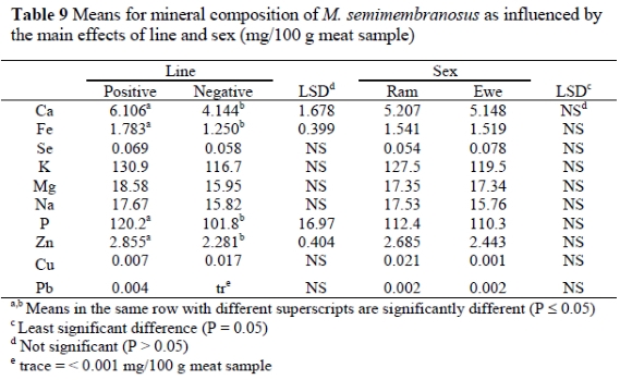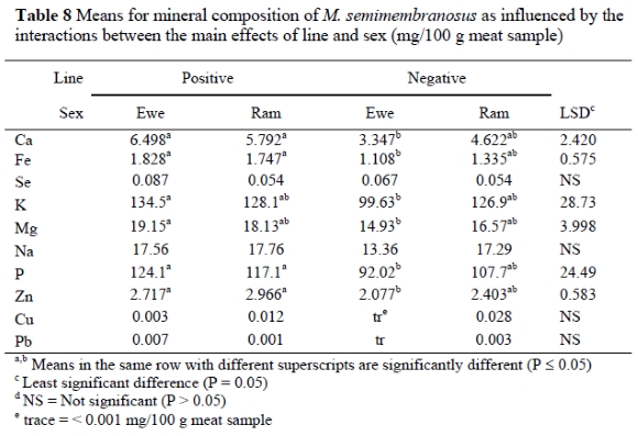 Results from this study indicated differences (P < 0.05) between the four groups involved in the line x sex interaction regarding the Ca, Fe, K, Mg, P and Zn concentrations (Table 8). The major contributors to the mineral concentration of the mutton were K (±122 mg/100 g meat sample) and P (ca. 110 mg/100 g meat sample). There was a general tendency for the PE group to have the highest mineral concentration, except for Zn and Cu, whereas the NE group had the lowest concentration in all the minerals, except for Se.