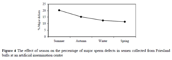 The percentages of major sperm defects during summer, autumn, winter and spring were 20.3±1.3%, 15.3±1.9%, 12.5±2.0% and 11.5±2.0%, respectively (Table 3 and Figure 4). Although the percentage of major sperm defects was below 20% during all seasons, which is considered acceptable (Bearden & Fuquay 1997; Coe 1999), significant (P = 0.01) differences were observed between all the seasons (Table 3).