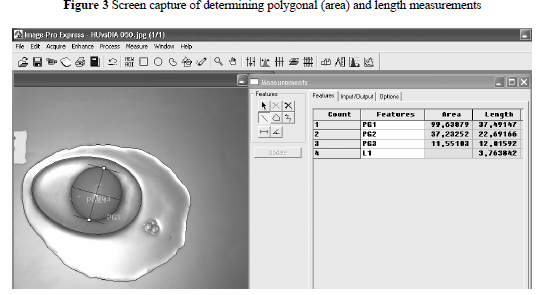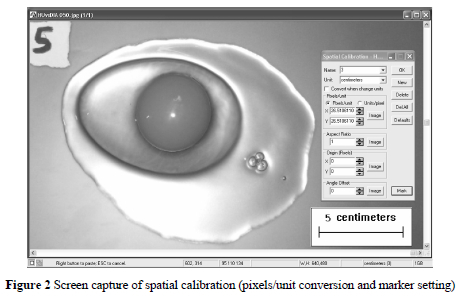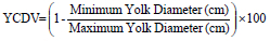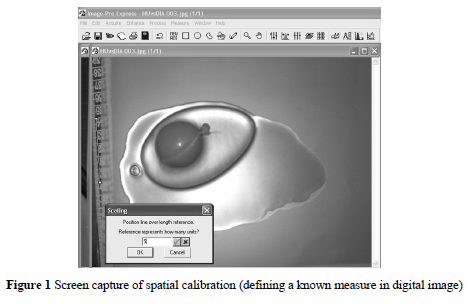 A total of 150 eggs from an 18-month old moulted brown layer flock (Lohmann Brown) were used for the study. Half of the eggs was broken immediately, and the remainder was stored at 18 0C and 55% relative humidity (RH) for seven days, and then broken to determine some quality characteristics. Eggs were weighed with an electronic scale (0.01 g sensitivity) and digital images of shelled and broken eggs were obtained by Canon Powershot A70 digital camera. Images were initially saved on a 256 MB Kingston (CF/256) flash card, and then transferred to PC via a USB cable and converted to bitmap images. Image-Pro Express® 4.5 software (MediaCybernetics, Inc., USA, 2003) was used to digitize the samples. During measurement of the quality characteristics via DIA, spatial calibration was applied and renewed for all images to pixels/unit (cm) conversion (Figure 1 and Figure 2) because a fixed tripod was not used during imaging. Measurements included quality characteristics, such as egg width, egg length, egg area (EA) in shelled eggs, and total egg content area (TECA), outer thin albumen area (OTAA), inner thick albumen width, length and area (ITAA), yolk area (YA) and minimum and maximum diameters of the yolk (Figure 3). An equation to represent the "Yolk Circular Deviation Value" (YCDV) was developed, which calculated the deviation of the yolk from perfect circularity. Efil & Sarica (1997) had suggested such modifications for yolk width, due to the fact that the yolk does not take a perfect circular shape when the egg is broken. The YCDV equation is of the type: