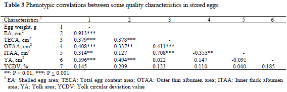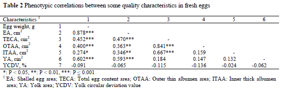 Some interior quality characteristics of fresh eggs and those stored at 18 oC and 55% RH conditions for seven days are presented in Table 1. The determined phenotypic correlations between some quality characteristics of fresh and stored eggs are shown in Tables 2 and 3, respectively.