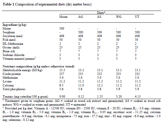 In the feeding experiment, diets were formulated with treated or untreated sorghum grain replacing maize in broiler starter rations. The composition of the experimental diets is shown in Table 1.