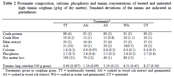 The results of the proximate composition, calcium, phosphorus and tannin concentrations of the untreated and treated sorghum grain are shown in Table 2.