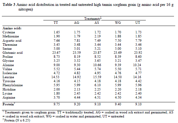 There was a 62% reduction in tannins when the grain was soaked in wood ash extract. Germination following treatment with wood ash extract caused up to 85% reduction in the tannin content of the grain. Reduction in tannins in the wood ash treated sorghum grain was in agreement with the findings of other researchers (Mohammed & Ali, 1988; Mukuru, 1992; Mukuru et al., 1992; Okot & Mujabi, 2001) and is probably due to polymerization of tannins to other compounds in an alkaline medium or due to reactions of tannins with cations such as potassium, sodium and calcium which are abundant in wood ash. The effect of wood ash treatment on the quality of protein of sorghum grain is presented in Table 3.