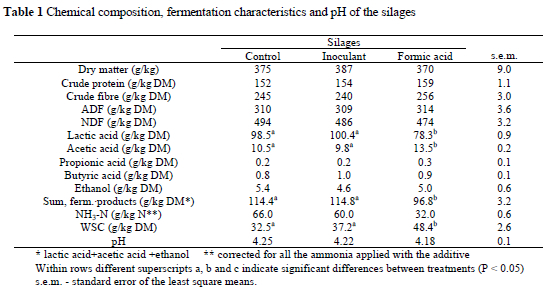 Silage DM content was determined by drying at 105 oC for 24 h, and not corrected for possible volatile fatty acids (VFA) and ethanol losses. Silage fermentation quality and water-soluble carbohydrate concentrations were determined as reported by Nowak et al. (2004). Original silage samples and in sacco residues were analysed for NDF and ADF levels according to the method of Van Soest et al. (1991). When ammonia-N was used as a quality criterion, a correction was used for the ammonia-N applied through Foraform in the FO treatment (Selmer-Olsen, 1995).