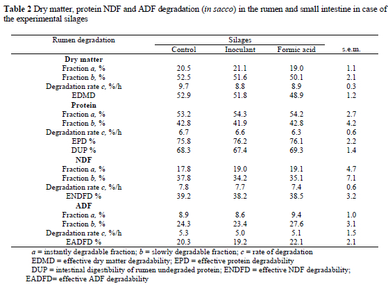Effective protein degradability (EPD) of 76% for the formic acid treated silage (FO) was similar to results of Selmar-Olsen & Mo (1997) and Polan et al. (1998), but higher than the value of 65% reported by Thomas (1982). According to Keady & Steen (1994), formic acid additives decreased DM and protein degradation in the rumen. Nowak et al. (2004) found that formic acid slightly but not significantly decreased ruminal effective degradability of wilted grass silage. In a laboratory scale experiment Gąsior & Brzóska (1999) found that formic acid supplementation decreased protein degradability both in the silo during fermentation and in the rumen. However, in an experiment conducted by Gąsior & Brzóska (2000) on a commercial scale, they found no significant effect of formic acid and inoculant on EPD of grass silages. No significant effects of silage additives on rumen protein degradation were measured by the in sacco method (Rooke et al., 1983; Polan et al., 1998; Yang et al., 1998). Cushnahan & Mayna (1995) suggested that extensive silage fermentation may increase fraction a and reduce fractions b and c.