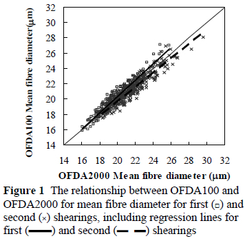 The regressions between test methods for FC accounted for 32% and 56% of the variance for first and second shearings respectively. These low results are likely to be associated with the very low curvature of mohair and the method of sample preparation used on the OFDA2000.