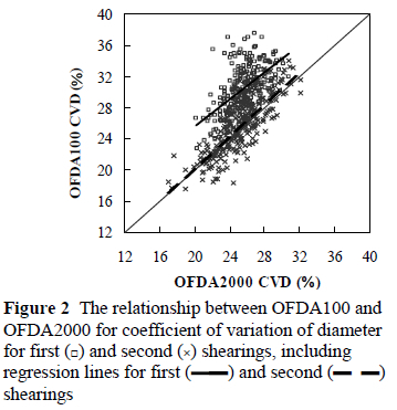 The regressions of CVD results from the two test methods accounted for 32% and 68% of the variance for first and second shearings respectively. The OFDA2000 under-estimated CVD at the first (P < 0.01) and second (P < 0.001) shearings (Table 1). The first shearing CVD results were higher and more variable than those for the second shearing (Figure 2), due to the presence of coarser birth coat fibre in the first fleece. At both shearings the OFDA2000 was operated with a distribution-trimming algorithm switched on, which trims measurements more than 4 standard deviations above the sample mean (Baxter, 2001). This may have affected the CVD results at the first shearing and would have lowered the CVD of some highly variable samples, this may explain the difference in regression results between shearings.