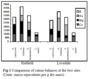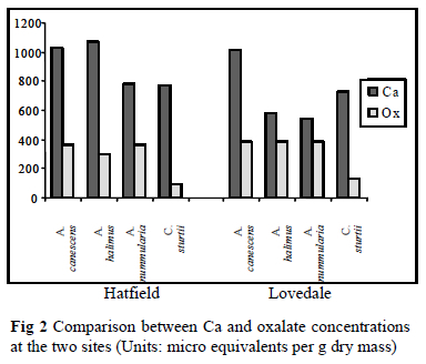 From the cation concentration (Fig. 1) it can be seen that the highest cation concentration was in A. halimus at both sites, while it was the lowest in C. sturtii. Assuming that Ca is mainly bound by oxalate, the following was noted (Fig. 2): The Ca concentration was the highest in A. canescens at both sites. Lower values were observed at Lovedale. However, higher oxalate concentrations were noted which lead to low free Ca. Cassia sturtii in this case had a high value of free Ca, indicating that this is calciotrophic species.