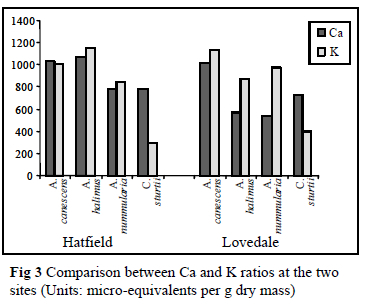 A Ca:K ratio of almost equal to 1, was noted at Hatfield (Fig. 3), while the ratio was < 1 at Lovedale for the Atriplex spp. For C. sturtii a higher Ca than K concentration was noted, thus a further indication of the calciotrophic nature of C. sturtii.