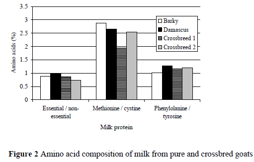 The concentrations of unsaturated fatty acids in the milk from Crossbreed 2 were lower than that of both the Barky and Damascus goats. The milk fat from Crossbreed 1 had the best ratio (P < 0.01) of unsaturated/saturated fatty acids in all breeds studied (Fig. 1). The ratio of essential amino acids varied considerably between the milk of parent breeds and their crossbreds. The lowest value was in milk from Crossbreed 2, followed by the milk of Crossbreed 1 (Fig. 2). Generally, milk of both crossbreds has a satisfactory balance of essential amino acids, equalling or exceeding the FAO - WHO - UNU requirements for each amino acid.
