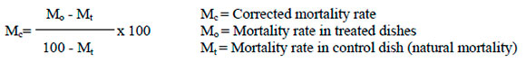 Analysis of variance (McClave & Dietrich II, 1979) was carried out on the data and differences between treatments, when significant, were separated using the Duncan Multiple Range test. The logarithmic regression of the doses and the probit were used to determine the LD50 of the product.
