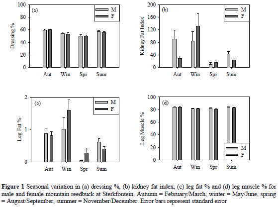 Leg fat % has not previously been measured in mountain reedbuck. At Sterkfontein, LFP was significantly lower in August/September (spring) than in other months, especially May/June (winter).
