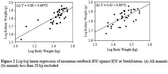Previous studies have found that kidney weights (KW) are not always directly proportional to body weights (BW) because smaller animals may have relatively heavy kidneys (Batcheler & Clarke, 1970; Dauphine, 1975; Van Vuren & Coblentz, 1985). In such cases, an allometric relationship between KW and BW would affect the KFI, and would make it an unreliable measure of body condition. To test for an allometric relationship and, therefore, to check the validity of using KFI, KW and BW from Sterkfontein were compared using log-log linear regression analyses. Previous studies have also shown that KW can be affected by season, which would also influence KFI. To test this, the ratios of KW to BW were compared between seasons using a 2-way ANOVA to determine whether the KFI should be adjusted to allow for any seasonal differences. Further analyses using KFI were then conducted in light of the results of the above two tests. A further complication arises if body condition is influenced by age because comparisons would only then be valid using animals of similar age. Because juveniles can be differentiated from adults using BW, age differences in body condition were tested for using linear regression analyses comparing BW with dressing %, KFI, LFP, and LMP.