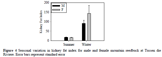 Norton (1989) found significant differences in KFI between male and female mountain reedbuck at Rolfontein and Doornkloof Nature Reserves in the Karoo, with males having lower values. The indices were very variable, especially for the females, with some individuals having almost no perinephric fat and several having indices of more than 150. The mean KFI for immature animals was similar in the two sexes up to the age of 20 months, but after that the males' condition dropped to just over half that of the females. It was suggested that males were subject to greater stress than females. No seasonal differences were tested for because the culls were carried out within a single month at both sites (August at Rolfontein and June at Doornkloof). At Sterkfontein males had lower KFI values than females in June and August as well, but higher values at other times. It is possible, therefore, that had separate culls been carried out at Rolfontein and Doornkloof between November and March, males would have had higher KFI values than females. In this case, rather than males being subjected to more stress than females overall, differential physiological requirements of the sexes may have driven seasonal variation in body condition.