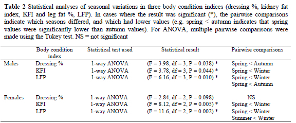 The seasonal variation in KW was tested using a 2-way ANOVA (with animals under 20 kg excluded). No differences were found between males and females (ANOVA: F = 0.057, df = 1, P = 0.813) or between seasons (ANOVA: F = 1.893, df = 3, P = 0.152). It was, therefore, not necessary to adjust the KFI according to seasonal variation in KW for animals over 20 kg.