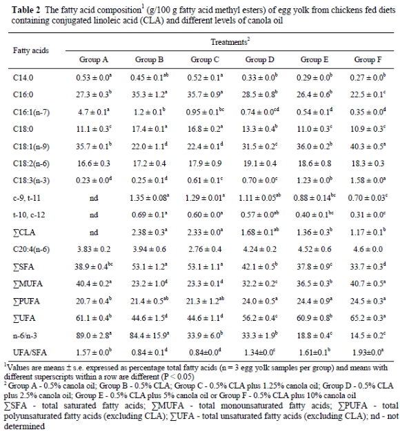 Ninety Single Comb White Leghorn laying hens were assigned to six groups (15 per treatment) and were housed in individual cages with a light regimen of 16 h light : 8 h darkness. They were fed for 50 days one of the following six experimental diets: Group A - containing 0.5% canola oil; Group B - 0.5% CLA; Group C - 1.25% canola oil plus 0.5% CLA; Group D - 2.5% canola oil plus 0.5% CLA, Group E - 5% canola oil plus 0.5% CLA or Group F - 10% canola oil plus 0.5% CLA. The ingredient composition of the experimental diets and the fatty acid composition of the CLA-80 (Natural Lipids, Hovdebygda, Norway) are presented in Table 1. All diets contained 150 g crude protein/kg and 11.7 MJ metabolisable energy/kg.