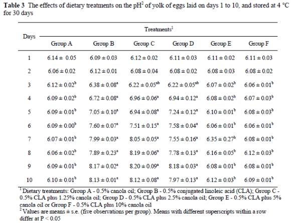 Five whole eggs per group were collected daily on days 1 to 11 of the study for yolk and albumen pH measurements. The eggs from days 1 to 10 were stored at 4 °C and those from day 11 were stored at room temperature (21-24 °C), for 30 days. Previous studies (Aydin et al., 2001) have shown that the cold storage conditions (4 °C) resulted in changes in the quality of eggs from CLA-fed hens. After the 30 days the eggs were broken and separated into yolks and albumen. Discoloration of the yolk and albumen were recorded. The albumen and yolk samples were then stirred with a glass rod for pH measurements [Fisher Scientific Accumet pH meter (910), Pittsburgh, PA].