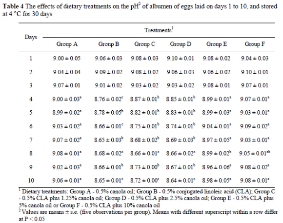 The pH of albumen from newly laid eggs ranged between 7.6 and 8.5. During the storage of eggs, the pH of albumen increased at a temperature dependent rate to a maximum of about 9.7 (Heath, 1977). The rise in the albumen pH is caused by a loss of carbon dioxide from the egg through the pores in the shell (Heath, 1977). The pH of yolk in freshly laid eggs is generally about 6, but during storage, the pH gradually increases to between 6.4 and 6.9. In the present study, when the shell eggs were stored at 4 °C, egg yolks (laid on days 4-10) from Groups B, C and D had higher pH values compared to Group A. In the eggs stored at 4 °C the albumen pH of Groups B, C and D on days 4-10 of the feeding period were lower than in the other treatments. In the present study it was observed that adding 5% or 10% canola oil to the diet completely prevented abnormal pH changes in yolk and albumen of the eggs stored at 4 °C. In another study, high levels of animal tallow (9.5%) were reported to maintain the ratio of SFA to MUFA and prevented CLA-related colour changes and pH changes in yolk and albumen of the eggs stored at cold temperatures (Aydin & Cook, 2005). When eggs were stored at room temperature, no discoloration occurred in the yolk or albumen. Also, when fresh eggs were separated into yolk and albumen and stored at 4 °C for one month, no colour changes were observed in the yolk or the albumen (R. Aydin, unpublished observation). This unpublished observation suggested that the discoloration of yolk and albumen of the whole eggs stored at a cold temperature might be associated with the increased permeability of the vitelline membrane due to altered fatty acid composition such that minerals can move down their concentration gradient (Aydin et al., 2001).
