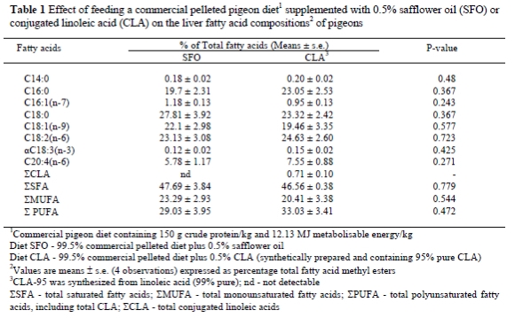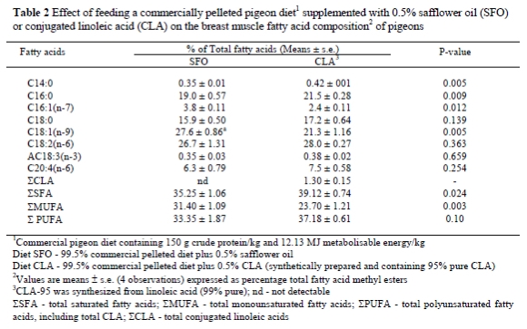 The pigeon house was divided into two sections and eight established breeding pairs per treatment were fed either a commercially pelleted pigeon diet (containing 150 g crude protein/kg and 12.13 MJ metabolisable energy/kg) mixed with 0.5% safflower oil (SFO, control) or 0.5% synthetically prepared CLA (contained 95% CLA) in the form of free fatty acid for 12 weeks. The experimental diets were mixed weekly and birds were fed fresh feed daily.