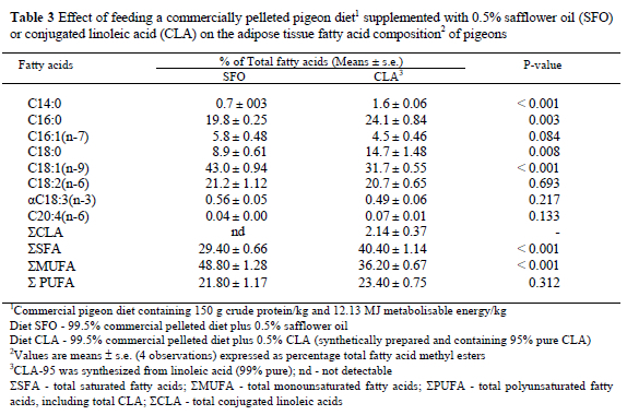 Hence, the objective of this study was to determine the effect of incorporating CLA in the diet on the fatty acid composition of the liver, muscle, abdominal adipose tissue, and egg yolk of pigeons.