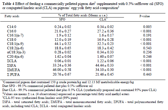 CLA is a group of naturally occurring fatty acids which affects the fatty acid composition of the tissues and egg yolk by inhibiting the stearoyl-CoA desaturase enzyme (Park et al., 2000). Dietary CLA influences the tissue and egg yolk fatty acid composition in a time and dose-dependent manner (Aydin & Cook, 2004). In the light of the previous experiments conducted in various species, it was suggested that dietary CLA influenced the fatty acid composition of different tissues and egg yolk differently in the pigeons.