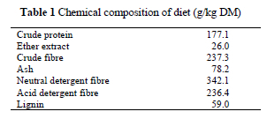 The research was carried out on 20 male ostriches equally divided into two age groups, 12 vs. 24 months. The birds were hatched and reared on a commercial farm on Sardinia (Italy). The ostriches were fed ad libitum on a diet consisting, on a dry matter basis, of 25% maize silage, 50% lucerne hay and 25% of a commercial concentrate. The chemical composition of the diet, determined according to procedures of AOAC (1984) and Van Soest et al. (1991), is reported in Table 1.