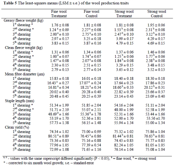 The LSM of the wool characteristic and S:P ratio analysed in this study are summarized in Table 6. From this table it is evident that nutritional stress did not have an influence on these traits. The exceptions were the higher number of crimps per 25 mm of the strong wool treatment group compared to their control (2nd shearing), as well as the higher CV in the strong wool treatment group (3rd shearing). The differences in Duerden at the 3rd shearing are probably the effect of the differences in MFD, as there were no differences in the number of crimps per 25 mm at that stage. It is evident from these tables that nutritional stress did not effect these traits from the 3rd to 5th and the 2nd and 3rd shearings, respectively.