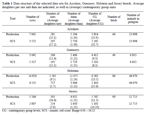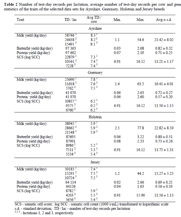 For the Ayrshire, Guernsey, Holstein and Jersey breeds, data consisted of test-day records of somatic cell count (SCC), and milk, butterfat and protein yields for lactations 1 - 3, calving from 1982 (1984 for the Guernseys) to 2004. These records were obtained from the Integrated Registration and Genetic Information System (INTERGIS) for cows participating in the South African Dairy Animal Improvement Scheme. The number of test-day records available was 418 806 for the Ayrshires, 179 466 for the Guernseys, 2 961 647 for the Jerseys and 8 826 442 for the Holsteins. Basic edits included deletion of records with unknown herds, unknown birth dates and calving dates, test-days recorded before five days in milk or after 305 days in milk, records of crossbred cows and age restrictions within lactations to ensure reasonable calving ages in a specific lactation (20 - 42 months for lactation 1, 30 - 54 months for lactation 2 and 40 - 66 months for lactation 3 for Holsteins and 17 - 40 months for lactation 1, 29 - 53 months for lactation 2 and 41 - 67 months for lactation 3 for the other breeds). Protein yield was set to zero for records where protein percentages were greater than 6% or less than 2%. The same was done with butterfat yield where butterfat percentages were higher than 9% or lower than 2%. Records where test-day milk yields were higher than 70 kg (90 kg for Holstein) or lower than 1 kg (2.5 kg for Holstein) were also deleted. Lactations should fit the following requirements to be included (specifications from IRIS - the national dairy management system):