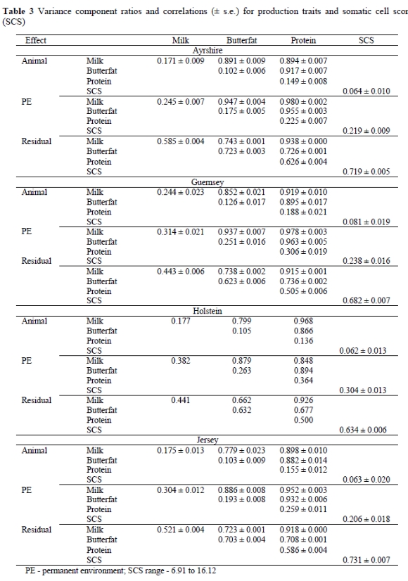 Heritability estimates for the animal effect of the Guernsey breed were higher for all traits compared to the other breeds, i.e. 24% for milk, 13% for butterfat and 19% for protein yield, as well as 8% for SCS. Estimates for the other breeds were all in the range of: 17% for milk, 10.5% for butterfat, 15% for protein yield and 6% for SCS. Danell (1982) found that heritability estimates of test-day yields were either the same or slightly lower than those of 305-day yields. Reents et al. (1995b) published heritability estimates averaging 26% for milk, 21% for butterfat and 23% for protein yields over three lactations, using fixed regression test-day models, treating the different lactations as different traits. Lidauer et al. (2003) reported heritability estimates of 26% for milk, 16% for protein and 17% for butterfat yields for first lactation Finnish dairy cattle using a multitrait repeatability test-day model, vs. 43% for milk, 29% for butterfat and 29% for protein yields, respectively on the same data set, using a multitrait lactation model. Pösö et al. (1996) also stated that heritability estimates for test-day milk yield tend to be generally low and distinctly lower than that of 305-day yields. Similar conclusions were drawn by Serrano et al. (2003) who also confirmed that low heritabilities were estimated with repeatability test-day animal models in sheep breeds. Heritability estimates obtained from this study were therefore on the lower range of test-day model estimates reported in the literature, but more comparable with these estimates than those obtained when fitting permanent environmental effects within lactation (Mostert et al., 2004b).