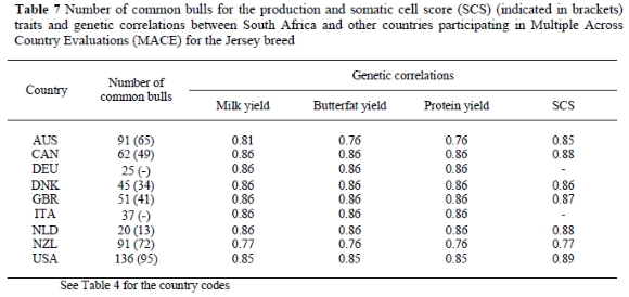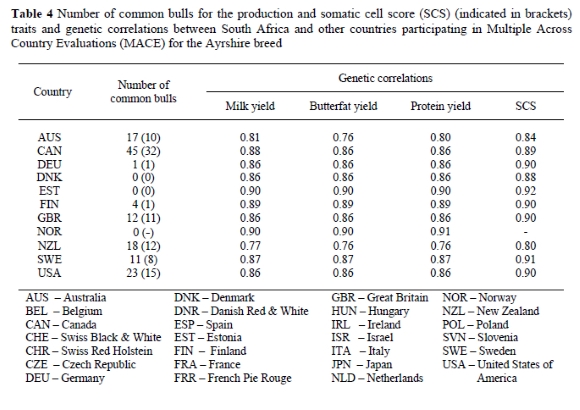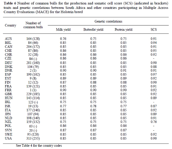 The Holstein breed is by far the largest breed participating in INTERBULL. A total of 27 countries participated in the March 2005 test run, with the USA contributing most sires (20 128) and France contributing least (112) sires to the evaluation. For South Africa 826 sires (616 for SCS) qualified for participation. With regards to common sires, French Pie Rouge (1) and Danish Red and Whites (2) shared the least and the USA the most (313) with South Africa. Correlations ranged from 0.75 with Australia (butterfat and protein yields), Ireland and New Zealand (all yield traits) to 0.91 with Danish Red and White for protein yield. Genetic correlations between other countries ranged from 0.95 between Canada and Japan, Denmark and Japan and the Netherlands and Japan for milk yield to 0.75 between amongst others, New Zealand and Canada for butterfat yield. A few countries do not yet participate in INTERBULL evaluations for SCS. Genetic correlations were generally higher for SCS in comparison with those for the production traits.