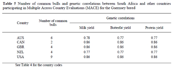 From Table 5 it is clear that not many Guernsey bulls are shared between South Africa and other countries participating in MACE. The Guernsey breed is, worldwide, small in numbers, with the USA contributing the most AI-sires (576) to this test run and South Africa only 40 bulls. Nevertheless, correlations between South Africa and these countries compared well with those between the rest of the participating countries, ranging from 0.76 between, amongst others, Canada and Australia for protein yield, to 0.95 between Canada and the USA for milk yield. With regards to the Guernsey breed, South Africa correlates least with New Zealand and Australia. Due to too few records being available for SCS of the Guernsey breed, South Africa does not yet participate in INTERBULL evaluations for this trait.