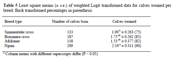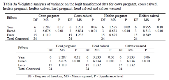 Data were analysed on a herd basis and not on an individual cow basis, and the different years were used as blocks in the statistical analysis of the data. The reproductive data (cows pregnant, cows calved, heifers pregnant, heifers calves, herd pregnant, herd calved and calves weaned) were subjected to a logit transformation before a weighted analysis of variance (Table 3a) was performed (SAS, 2001). Paired t-tests were performed on the least square means on the logit transformed data to compare breeds. For interpretation purposes the above data were back transformed to percentages. Standard analyses of variance (Table 3b) were performed on calf production data (birth weight, weaning weight, average daily gain, total gain cow efficiency and herd efficiency), with years as blocks. Student's t-LSD was calculated at a 5% significance level to compare breed type means. Shapiro-Wilk's test was performed on the residuals of all the variables to test for deviations from normality.